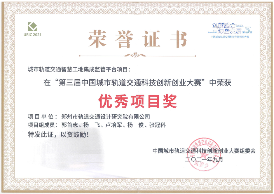軌道設(shè)計(jì)院城市軌道交通智慧工地集成監(jiān)管平臺項(xiàng)目榮獲“第三屆中國城市軌道交通科技創(chuàng)新創(chuàng)業(yè)大賽”優(yōu)秀項(xiàng)目獎(jiǎng)。