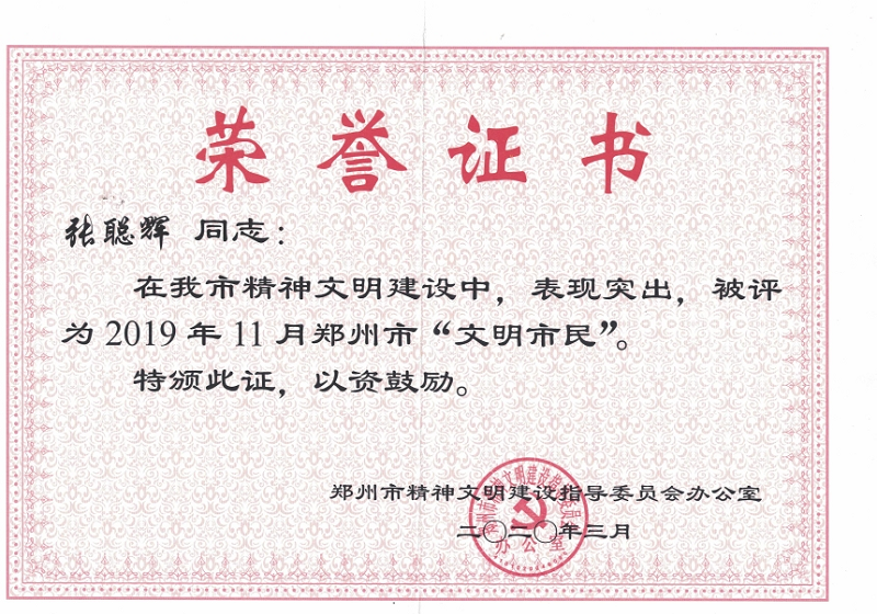 公司員工獲評(píng)鄭州市“文明市民”