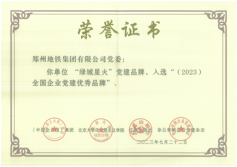12685鄭州地鐵集團黨委“綠城星火”黨建品牌被授予“2023年度全國企業黨建優秀品牌”榮譽稱號
