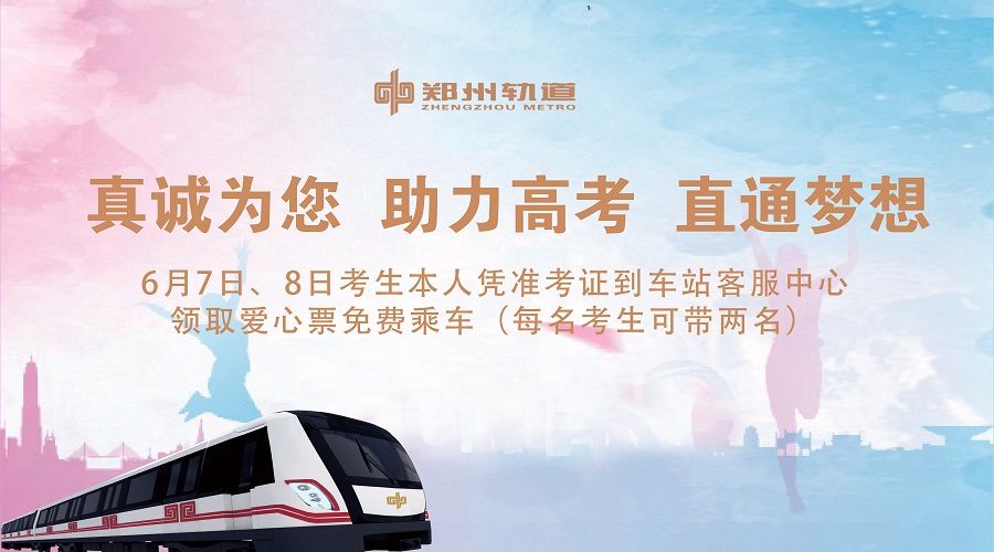 為給考生創造良好乘車環境,助力考生創佳績,鄭州地鐵將于6月7日、8日兩天開展2017年愛心助考活動。 設置助考站,愛心用品免費發 此次活動選取10個車站為愛心助考車站,分別是:(1號線)秦嶺路站、五一公園站、綠城廣場站、醫學院站、鄭州火車站、紫荊山站、黃河南路站;(2號線)關虎屯站、東大街站、南五里堡站。